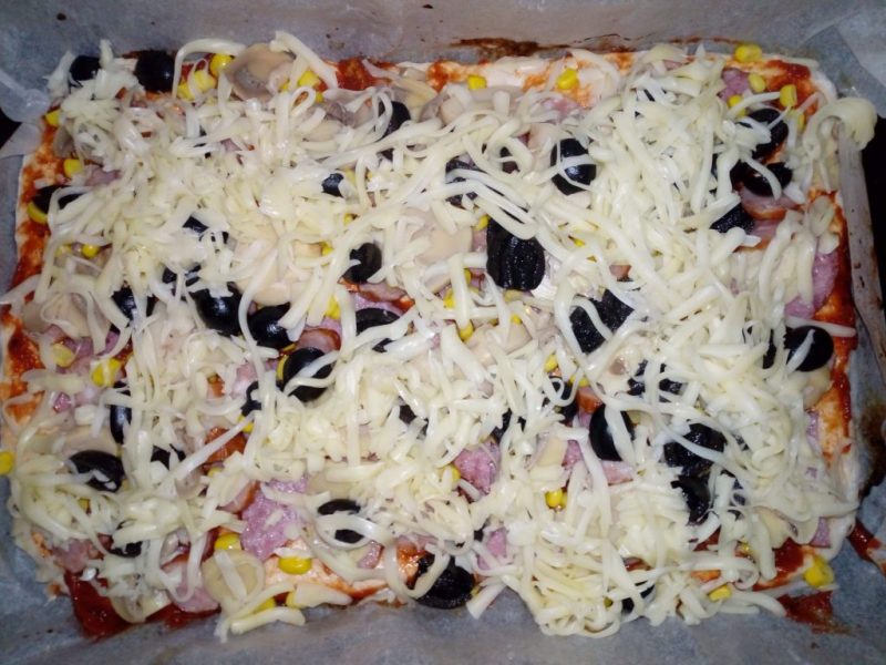 Pe pizza: sos de tomate, salam uscat, carnati, masline, porumb, ciuperci, cascaval