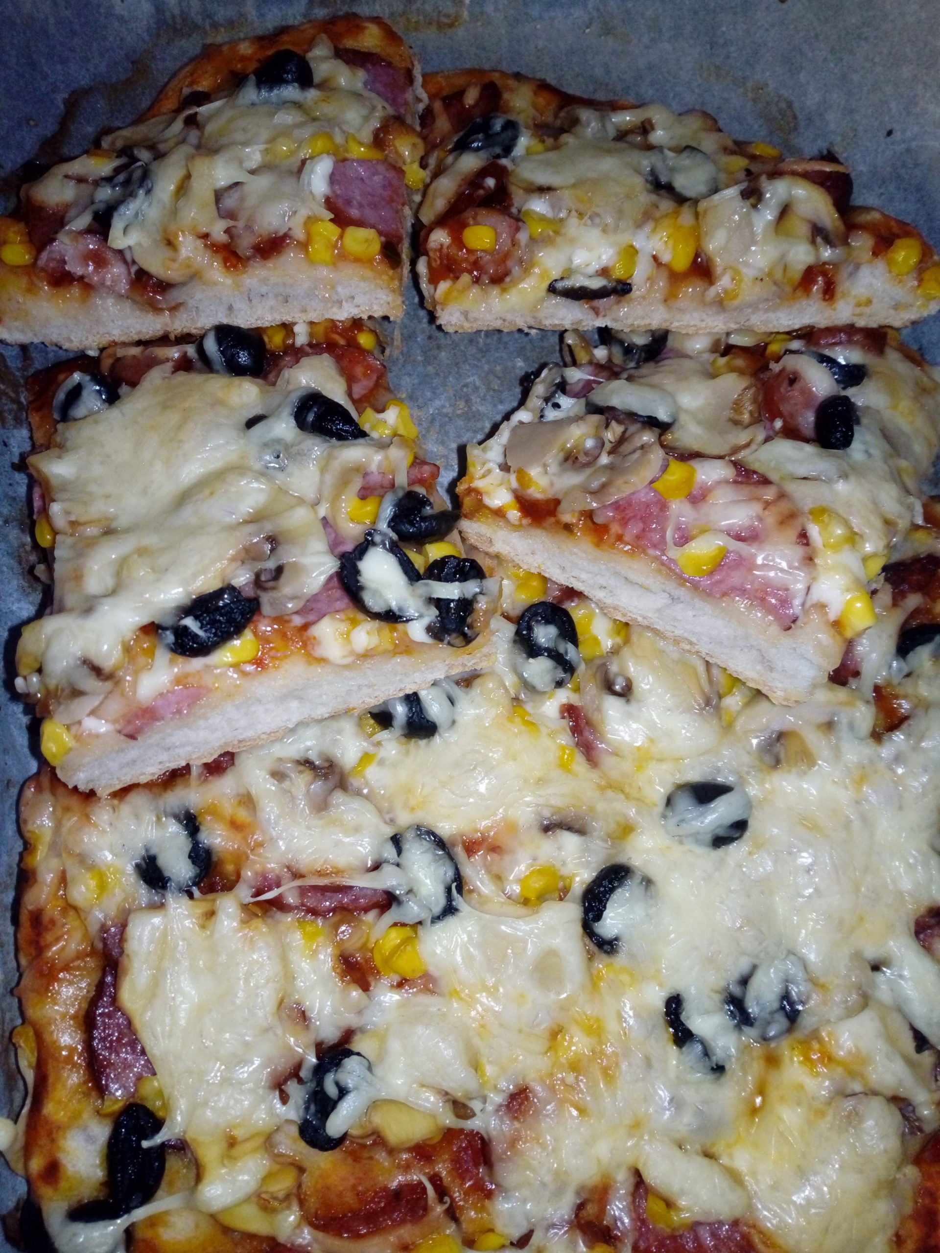 Pe pizza: sos de tomate, salam uscat, carnati, masline, porumb, ciuperci, cascaval
